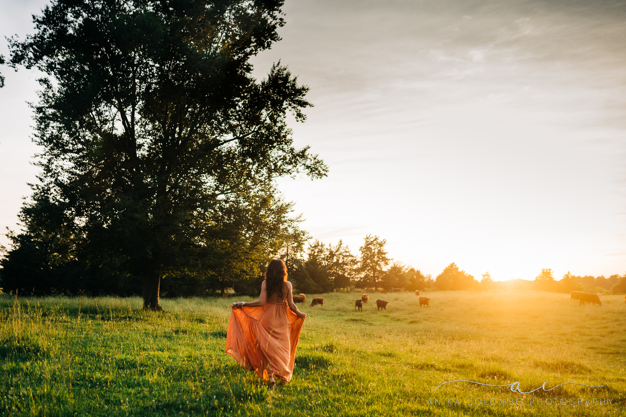woman walking in a field with cows at sunset