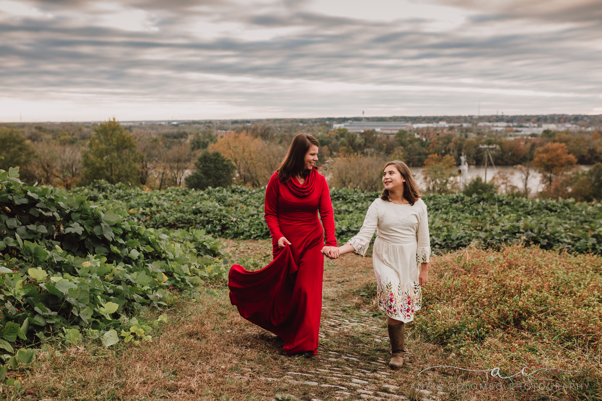 mother and daughter walking through a field over a hill in richmond va looking at each other and laughing