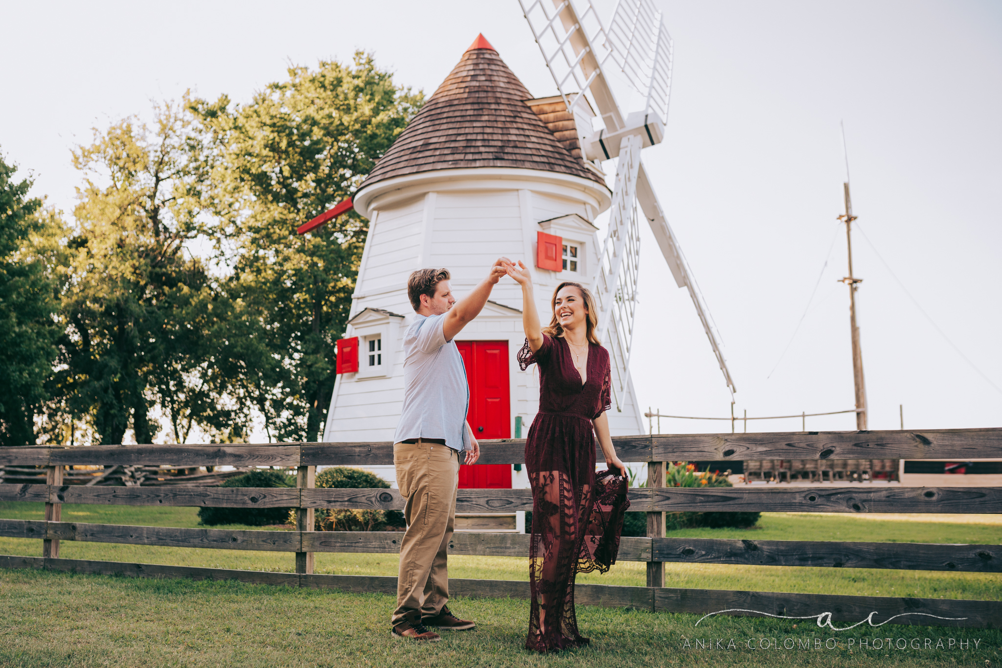 man twirling a woman in a long dress in front of a windmill